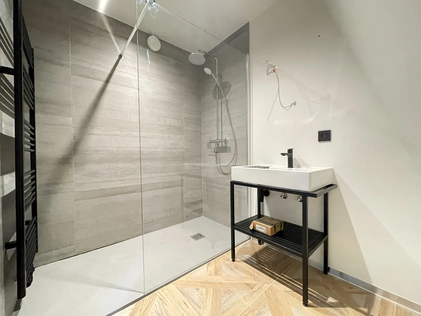 salle de douche avec meuble lavabo et sèche serviettes.