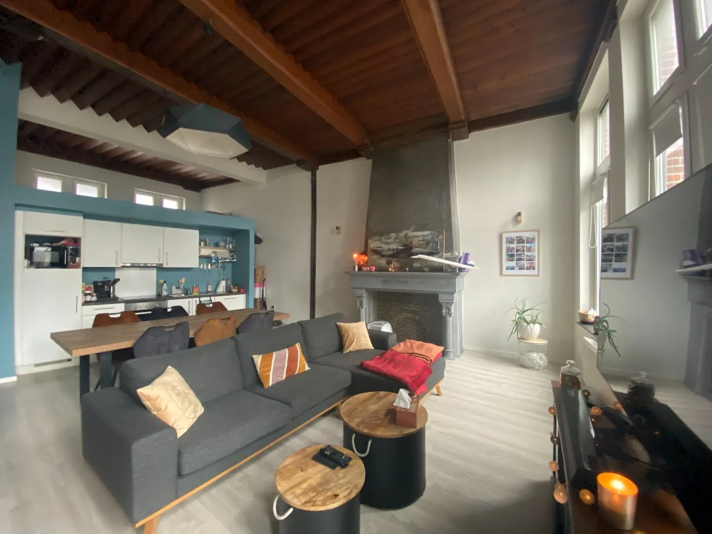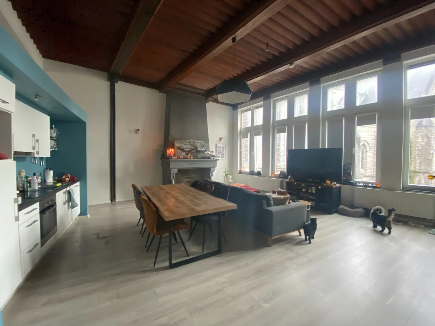 Hall d'entrée, séjour très lumineux comprenant salon et salle à manger, cuisine équipée avec four, taques électrique, hotte, lave-vaisselle, évier et nombreux rangements.