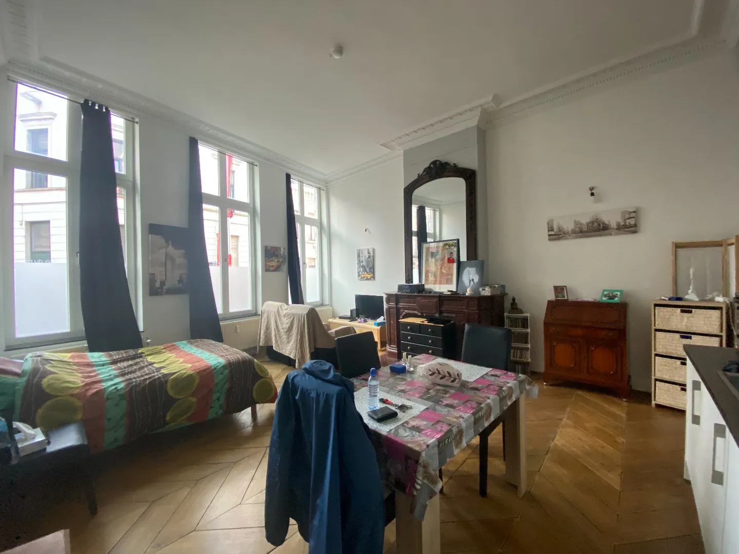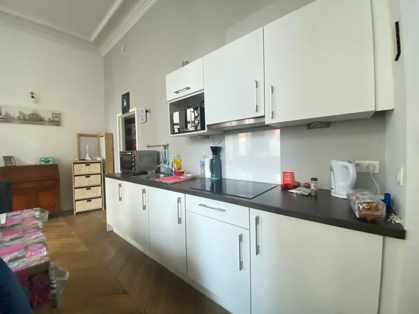 Pièce de vie très lumineuse avec cuisine équipée comprenant taques électriques, hotte, évier, nombreux rangements et emplacement prévu pour un lave-vaisselle.