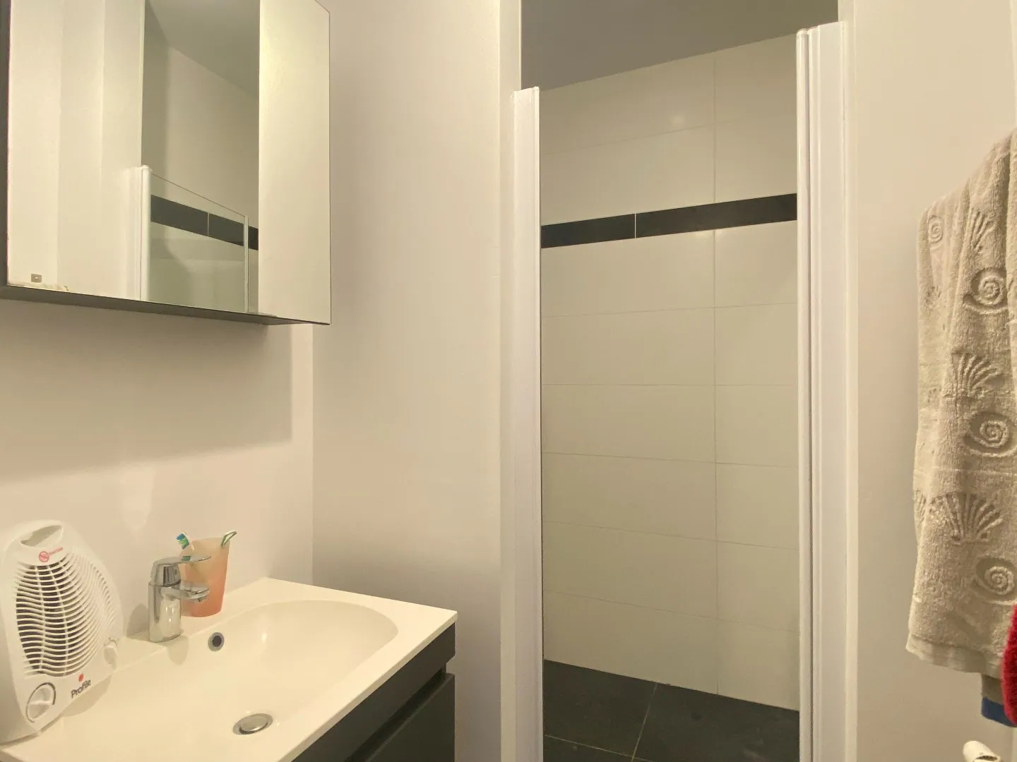 Espace buanderie/rangements. Salle de douche avec douche à l'italienne et meuble lavabo.