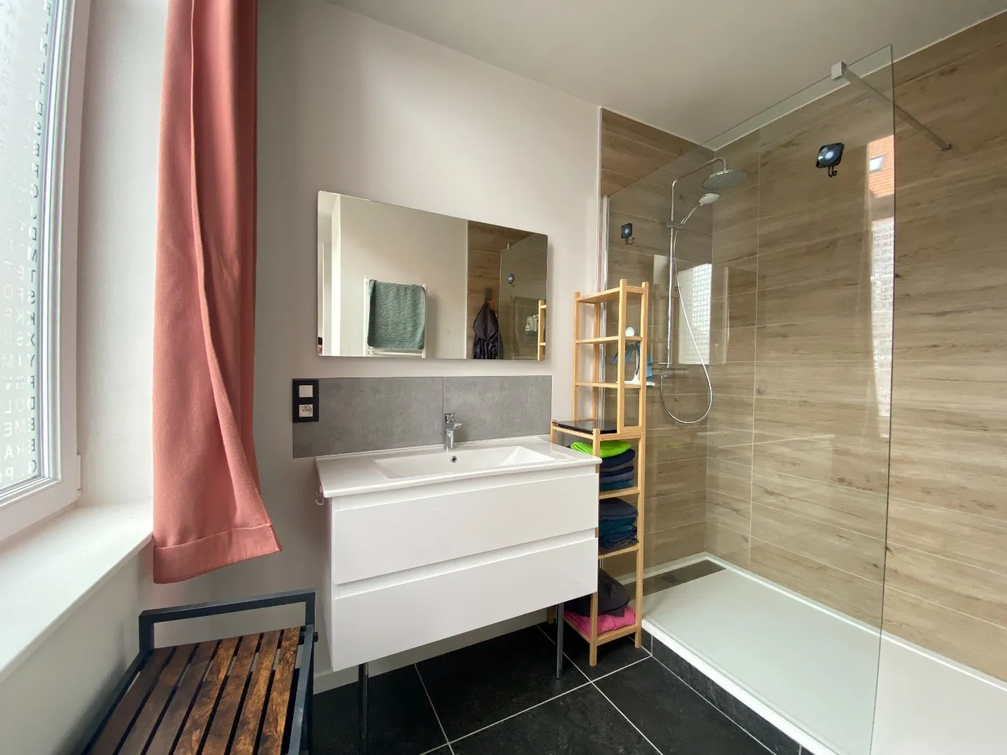 Une belle chambre, espace dressing, salle de bains avec douche italienne et meuble lavabo.