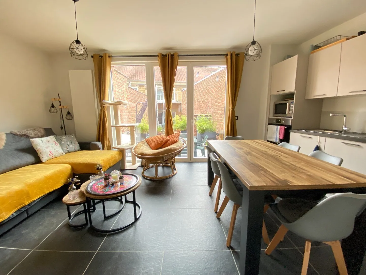 Séjour lumineux avec salon et salle à manger.