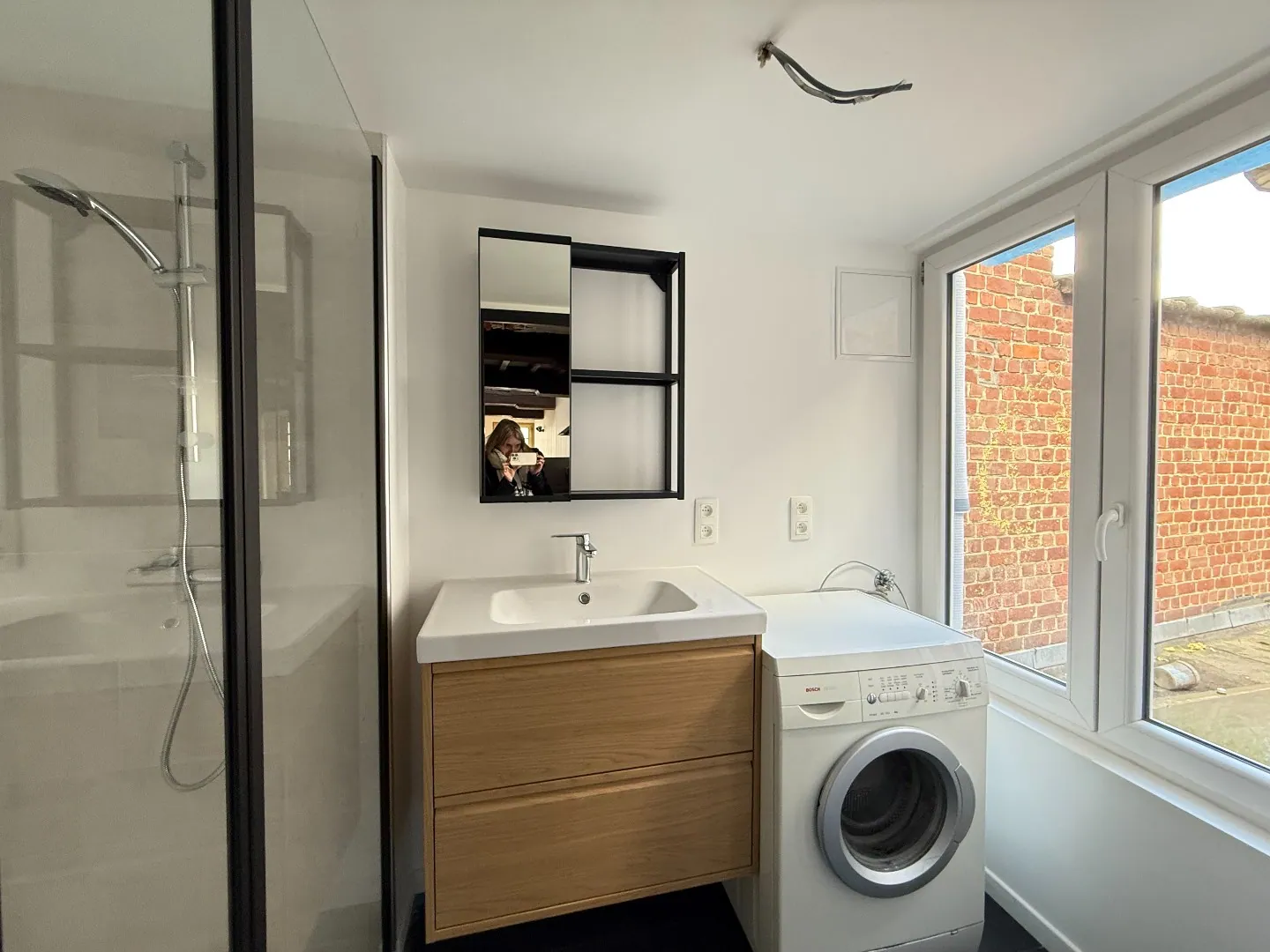 Dès l’entrée, un escalier moderne vous mène à un vaste espace de vie ouvert de ± 30 m², comprenant un salon, une salle à manger et une cuisine équipée (four, plaque vitrocéramique, hotte et évier). À l’arrière de la pièce, vous trouverez des toilettes séparées ainsi qu’une salle de douche élégante, dotée d’un miroir, d’un meuble lavabo simple vasque et de rangements.