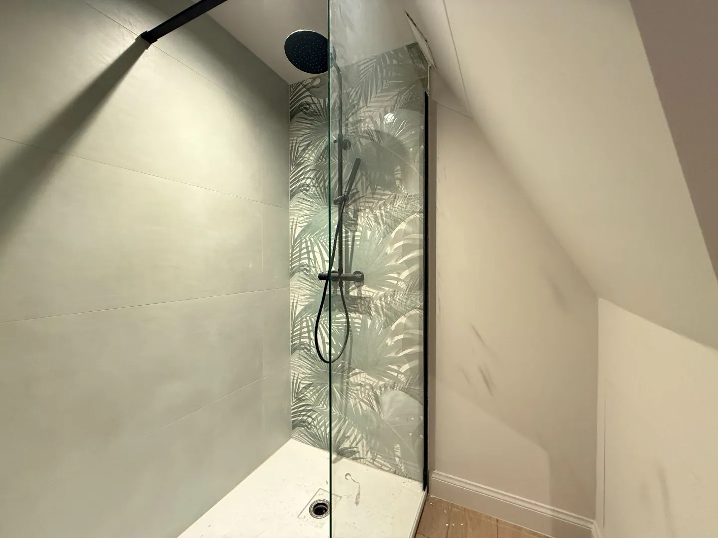 Un petit couloir conduit ensuite à une belle chambre sur la gauche, tandis qu’à droite se trouve une salle de bain élégamment aménagée, comprenant un large meuble avec simple vasque posée, un miroir lumineux, un sèche-serviettes et une douche à l’italienne nichée dans un coin de la pièce.