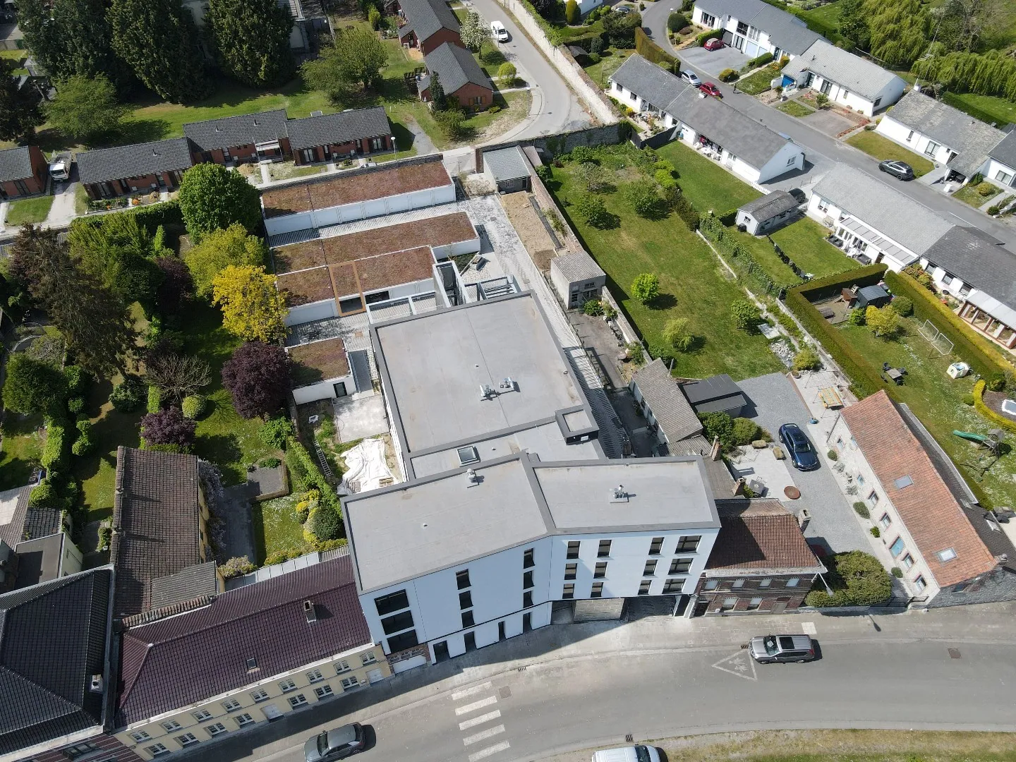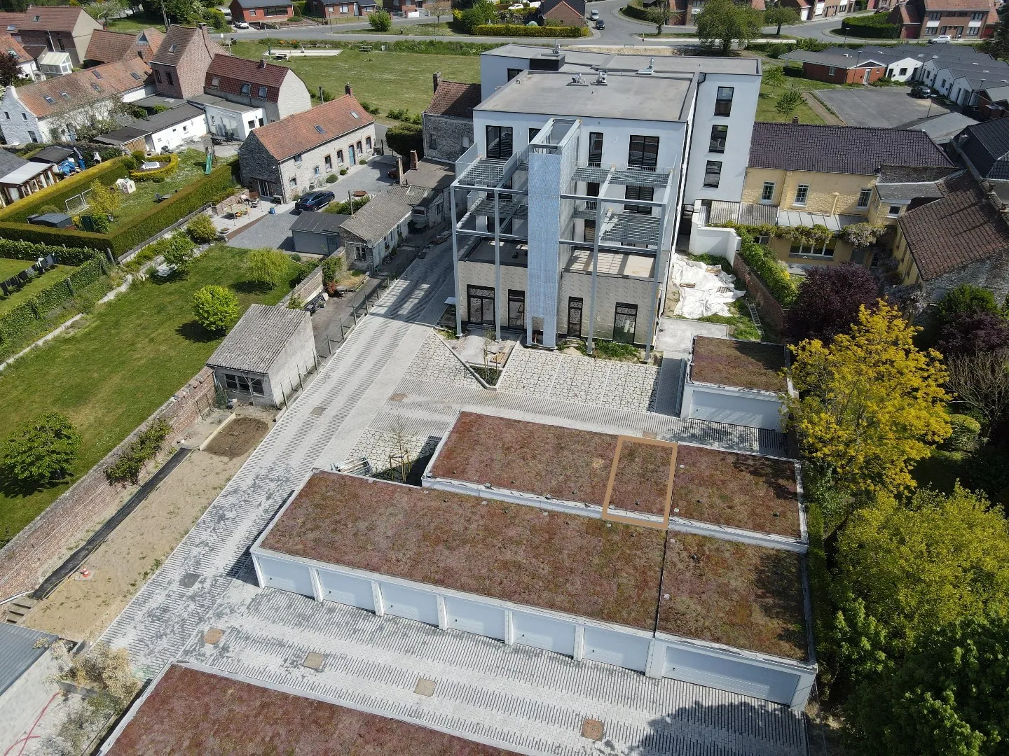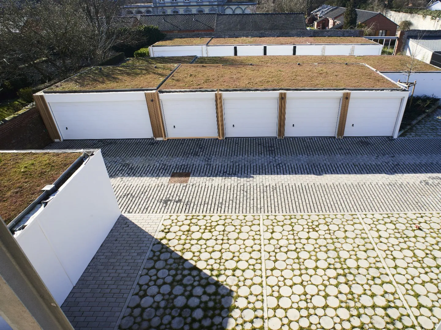 Il est possible d’ajouter des modules de recharges pour véhicule électriques et ce à la charge du locataire. Les toitures des garages sont également végétalisées avec des plantes de type « Sedum » à croissance lente. Afin d’arroser et/ou d’entretenir la partie centrale des toitures végétales dans laquelle des bulbes à floraison ont été plantées permettant une vue agréable des appartements, une citerne d’eau de pluie de 5 000L a été enterrée pour arroser les fleurs de manière minutée.