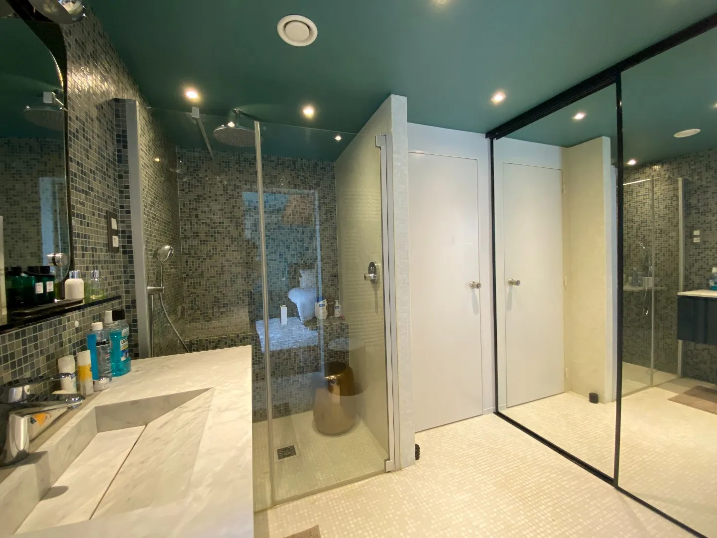 Un peu plus haut, l’espace s’ouvre sur deux chambres confortables, chacune équipée d'une salle de douche privative, avec toilette séparée à proximité pour plus de commodité. À partir de là, vous découvrirez un espace distinct, pensé comme un petit appartement indépendant. Celui-ci débute par un hall qui dessert une toilette séparée et une grande salle de douche moderne. Laissez-vous ensuite séduire par un espace de vie ouvert, comprenant une cuisine fonctionnelle, une salle à manger et un salon. Un escalier en métal, élégant et contemporain, mène à l’étage supérieur pour compléter cet espace.