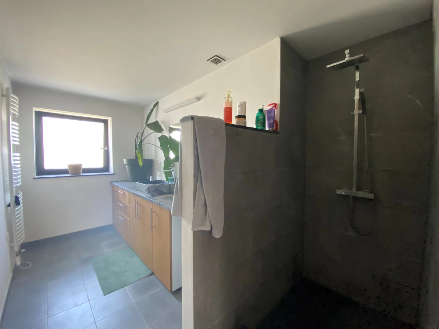 Vous trouverez un hall de nuit desservant 3 belles chambres ainsi qu'une salle de bain dotée d'une douche à l'italienne faïencée, d'un sèche-serviette et d'un lavabo simple vasque posé sur un plan de travail en pierre bleue, avec miroir et nombreux rangements.