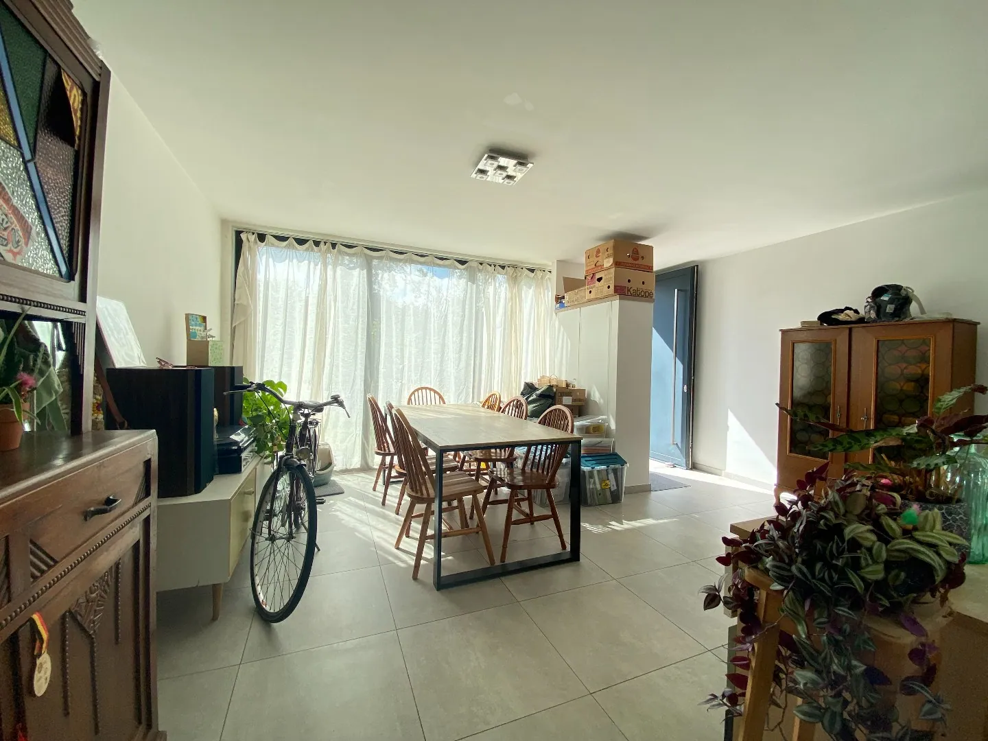 L'espace à l'arrière, situé en rez-de-jardin, est équipé de meubles de rangement en continuité avec la cuisine.