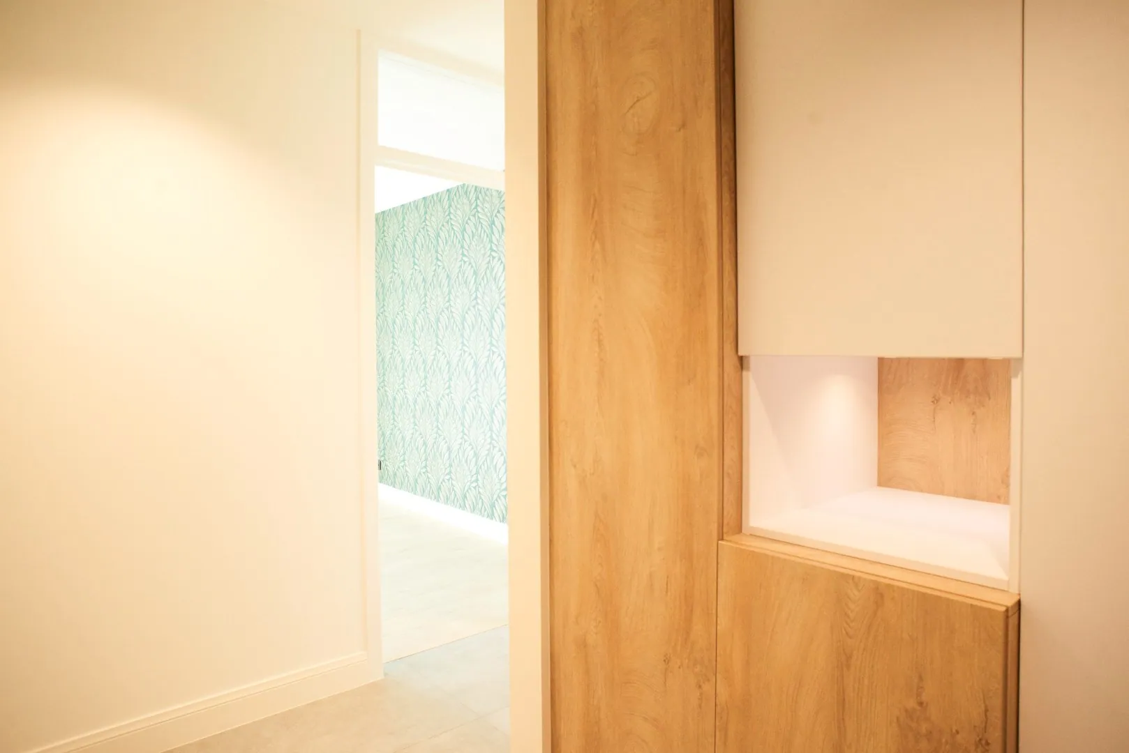 Ce superbe logement est l’appartement témoin de la promotion immobilière. Il a été équipé avec un placard intégré sur toute la hauteur du mur avec 3 penderies et 2 armoires de rangements et led dans le hall d’entrée. Celui-ci a été entièrement peint et/ou tapissé. Des luminaires et/ ou des pots intégrés sont installés. Ces équipements constituent un supplément de….