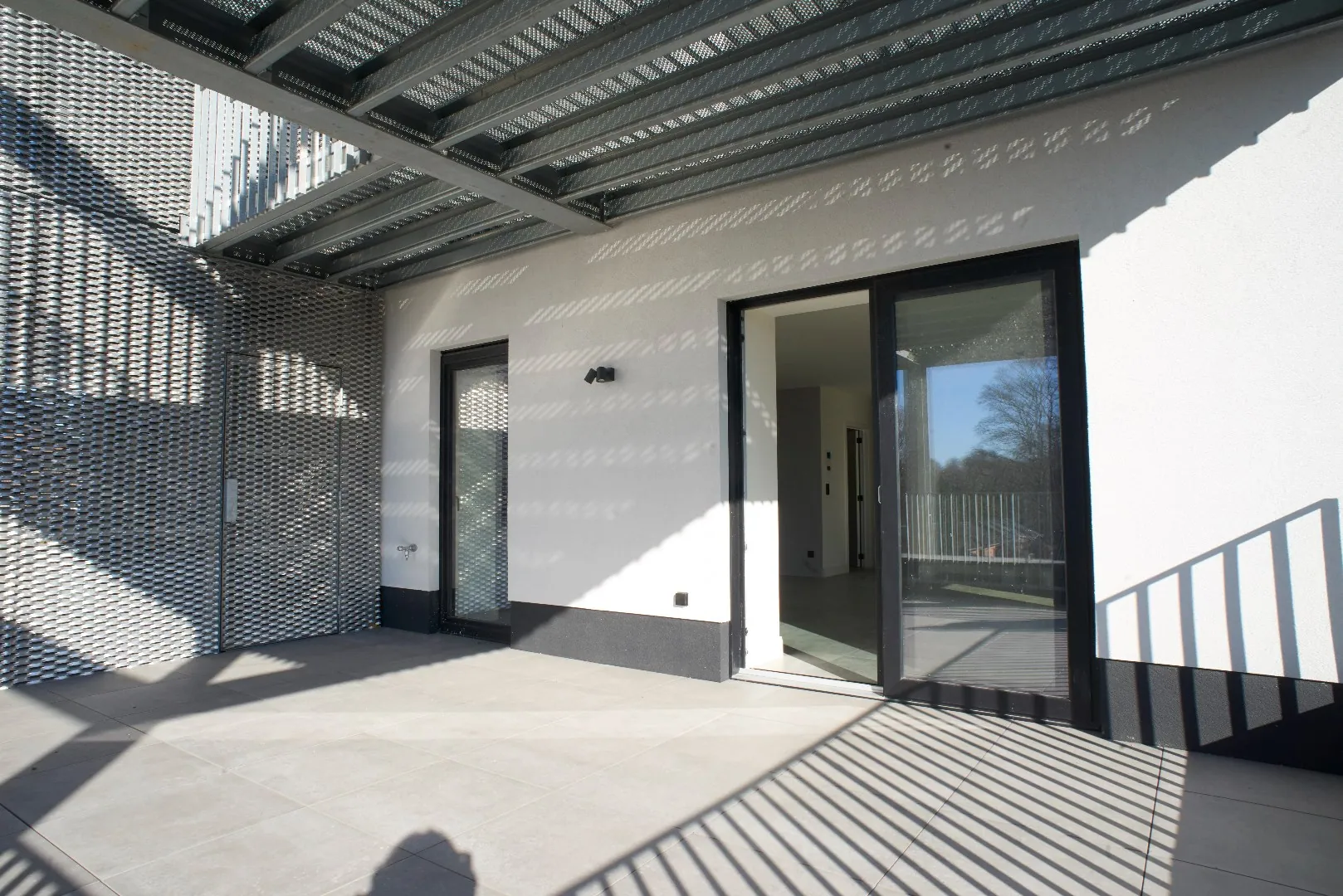 Terrasse de +/- 28m² carrelée sur plots et entourée d’un garde-corps métallique selon les normes de sécurité avec une vue dégagée sur les toits végétaux de la résidence et l’ancien château de Vaulx.
