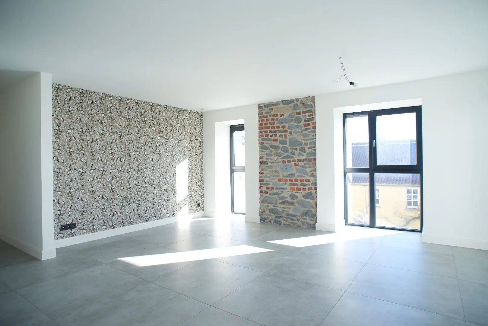 Portes et chambranles peints. 1 couche de peinture blanche partout sur les murs de l’appartement. 2 magnifiques murs de pierres ont été conservés dans le séjour et la salle de bains.