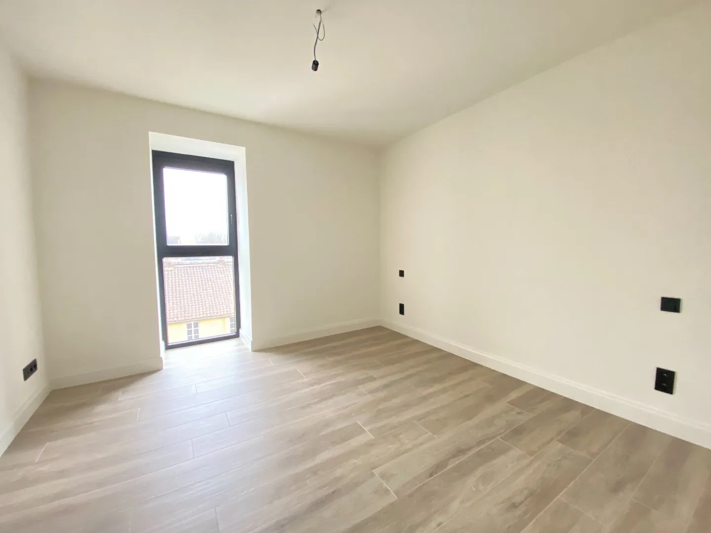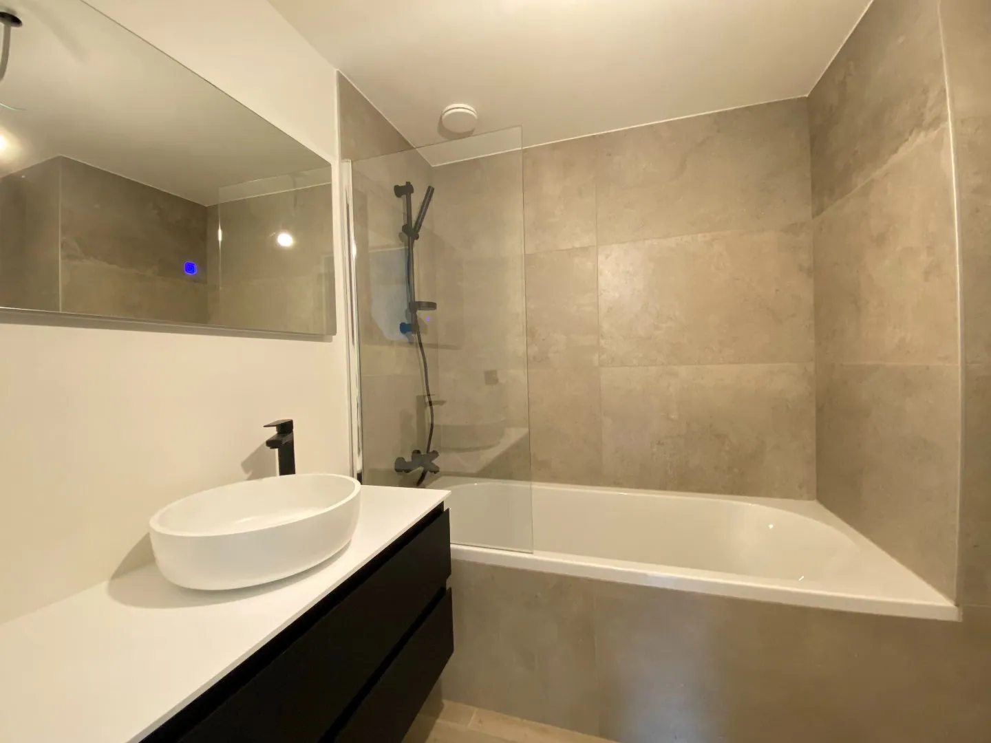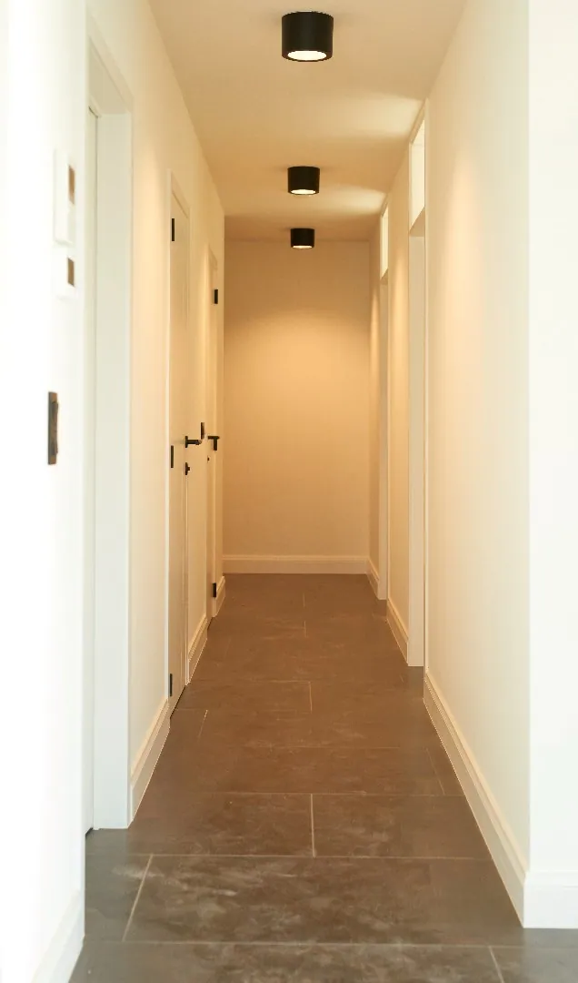 Dans le couloir se trouvent des faux plafonds dans lesquels les câbles électriques passent : ils ne sont pas sortis pour laisser la possibilité aux acheteurs de s’organiser eux même. Équipement Électrique noir mat partout, un vidéophone, sèche serviettes programmables. Prises TV internet dans le séjour et dans toutes les chambres.