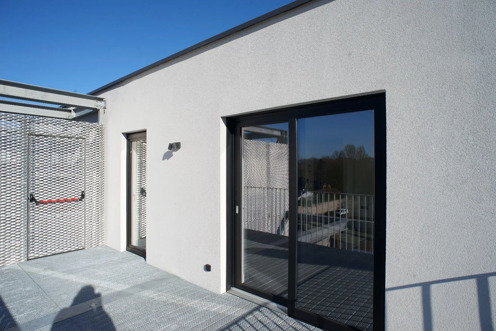 Cet escalier d’évacuation dessert l’ensemble des terrasses avoisinantes et jusqu’au sol via une échelle à crinoline. L’ensemble des portes d’évacuation est également bardé de métal déployé et la dernière porte (porte donnant sur les abords) ne s’ouvre que dans le sens de l’évacuation.