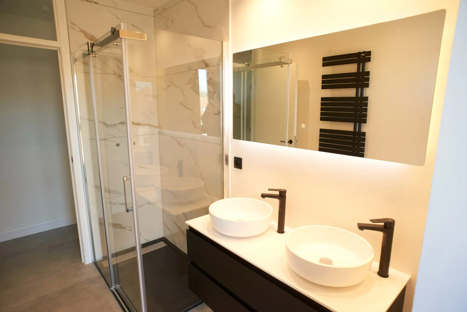 Salle de bains composée d'une douche italienne et d'un meuble lavabo avec double vasque et plan sous vasque en corian avec miroir éclairant et chauffant (anti buée) faïence en imitation marbre et sèche serviettes.