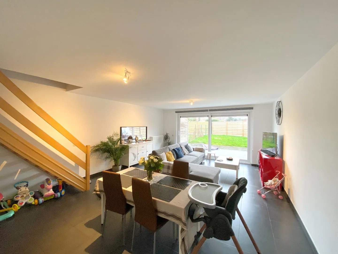 Dès l'entrée, vous serez accueilli par un hall spacieux avec un espace de rangement pratique. Vous y trouverez également un WC séparé suspendu avec lave-mains. Le séjour, lumineux et d'environ 30 m², se compose d'un salon et d'une salle à manger ouverts sur le jardin grâce à une grande baie vitrée, apportant une belle luminosité à l'ensemble. La cuisine entièrement équipée et ouverte sur l'espace de vie, comprend un four, des taques électriques, une hotte, un petit réfrigérateur, un lave-vaisselle et un évier. Un cellier/buanderie attenant offre un espace de rangement supplémentaire.