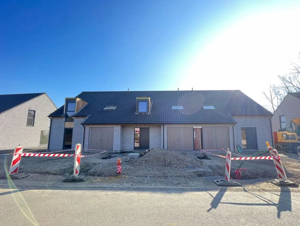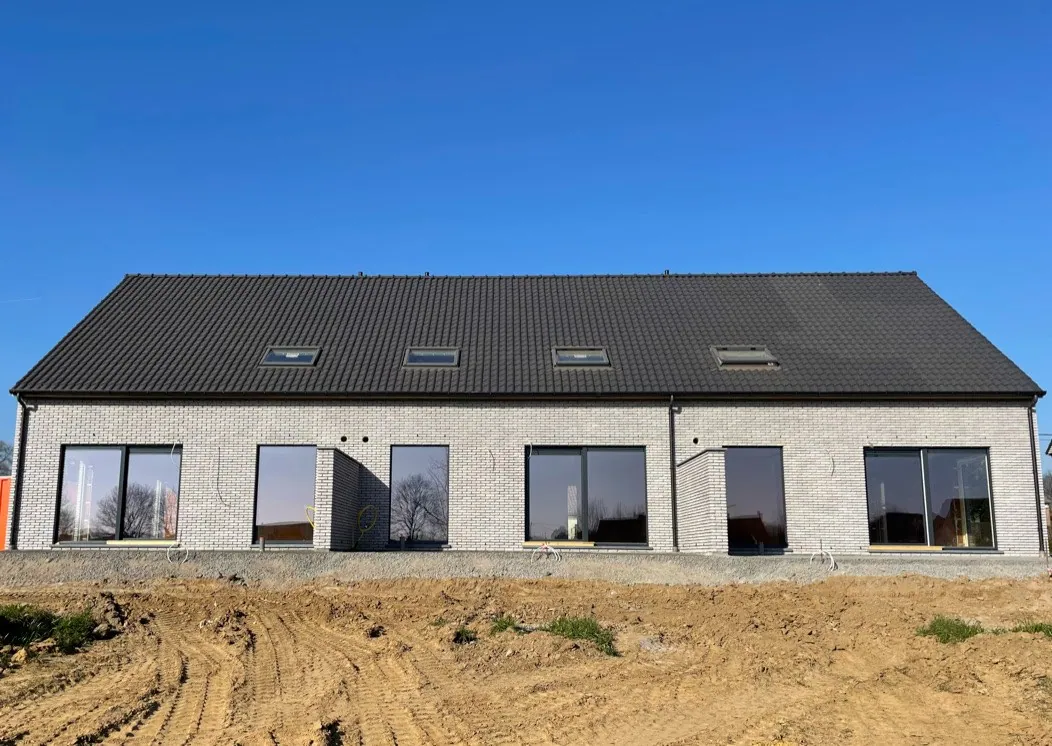 Extérieur: terrasse pourvu d'une couche de béton (à terminer), séparation en briques de façade entre les terrasses, dépôt de gravier en façade, citerne d'eau de pluie de 5000L (socarex prévus), pas d'aménagement prévu pour le jardin.